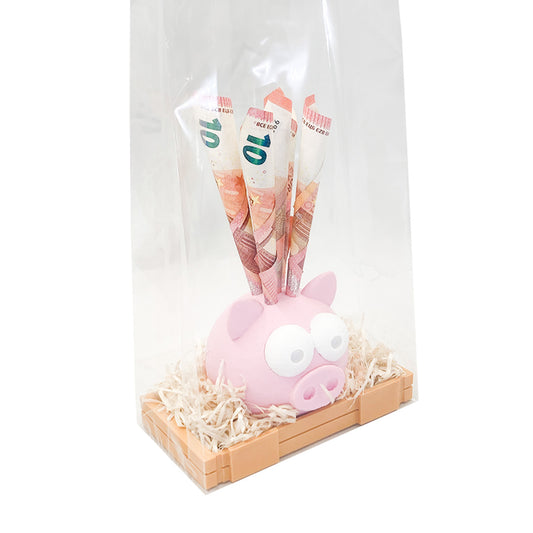 Spaarvarken in krat met stro