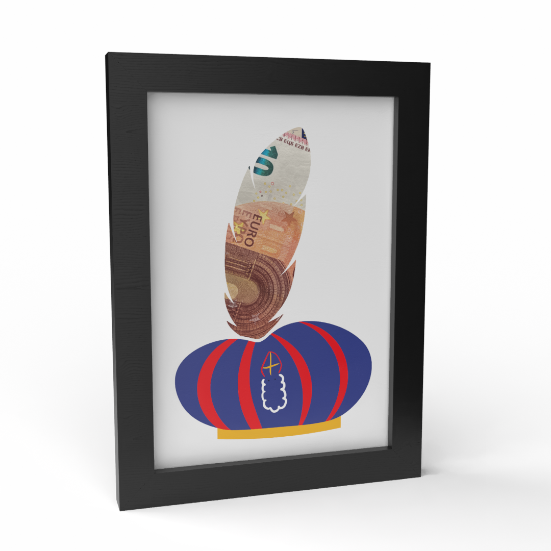 De fotolijst bevat een kleurrijke illustratie van een Pietenmuts, waarbij de veer is uitgesneden zodat je er geldbriefjes achter kunt plaatsen. Dit geeft een speels en verrassend effect: de briefjes schijnen door de veer heen en vormen zo een uniek en persoonlijk patroon. Voeg simpelweg je gevouwen geldbriefjes toe en creëer een origineel Sinterklaascadeau dat gegarandeerd de aandacht trekt.